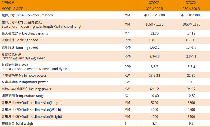 MAIN FUNCTION AND CHARACTERISTICS The drum can reduce water consumption from soaking,tanning and dyeing process and consumption of chemical raw material .There is a new structure inside the drum,so that it makes leather softer and dyeing more even in the same process time.It can load over 33% more than ordinary drums,the loading capacity can reach to 60—70% of the drum volume. 1、The drum body is made of stainless steel sheet ,with high quality insulation material filled between inner and outer shell. Multifunctioned exchanger system is installed on the other side of the drum. The drum is equipped with automatic liquid circulation filtration system of single direction rotation.Auxiliary electrical control box is installed on the right side of the drum for convenience of operation. 2、Heavy hammer exhaust valve is arranged on one side of the drum, so as to ensure that there is no pressure in the drum body during the working process. 3、Long baffles with a gradient are installed inside the drum,especially suitable for cowhides as their high mechanical effect. 4、Increase two sets of manual drainage on one side of the drum to save cleaning time. 5、For the drive system:through the triangle rubber belt,leather belt pulley gear box and spur gear drive.The drive shaft of the gear box is configured with pneumatic brakes. 6、For the electrical control system :we adopt frequency control . PLC circuit control . Main technical parameters